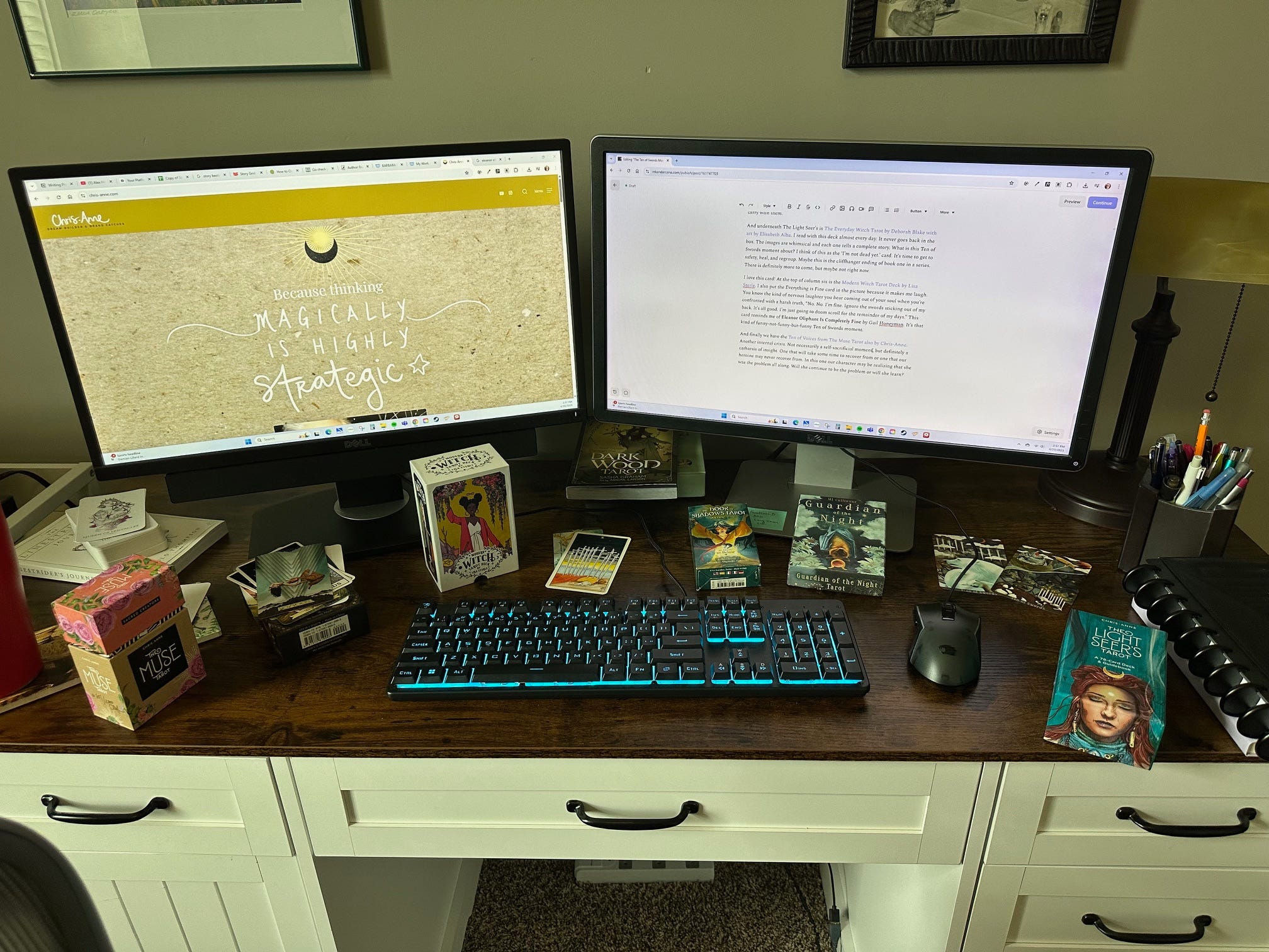 And, just for fun, this is what my writing desk looks like right now. It could be worse. It could look like this even if I weren’t writing about 10 versions of the Ten of Swords.